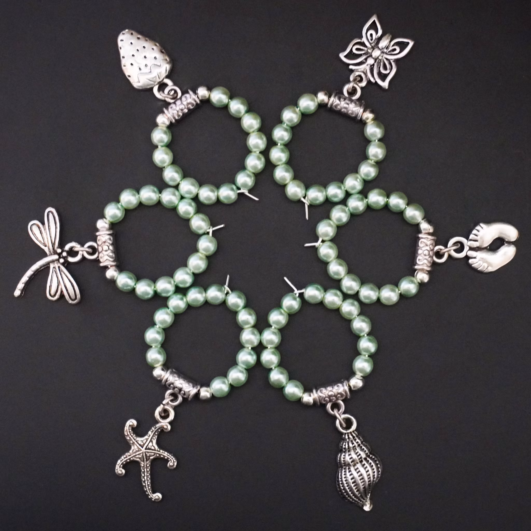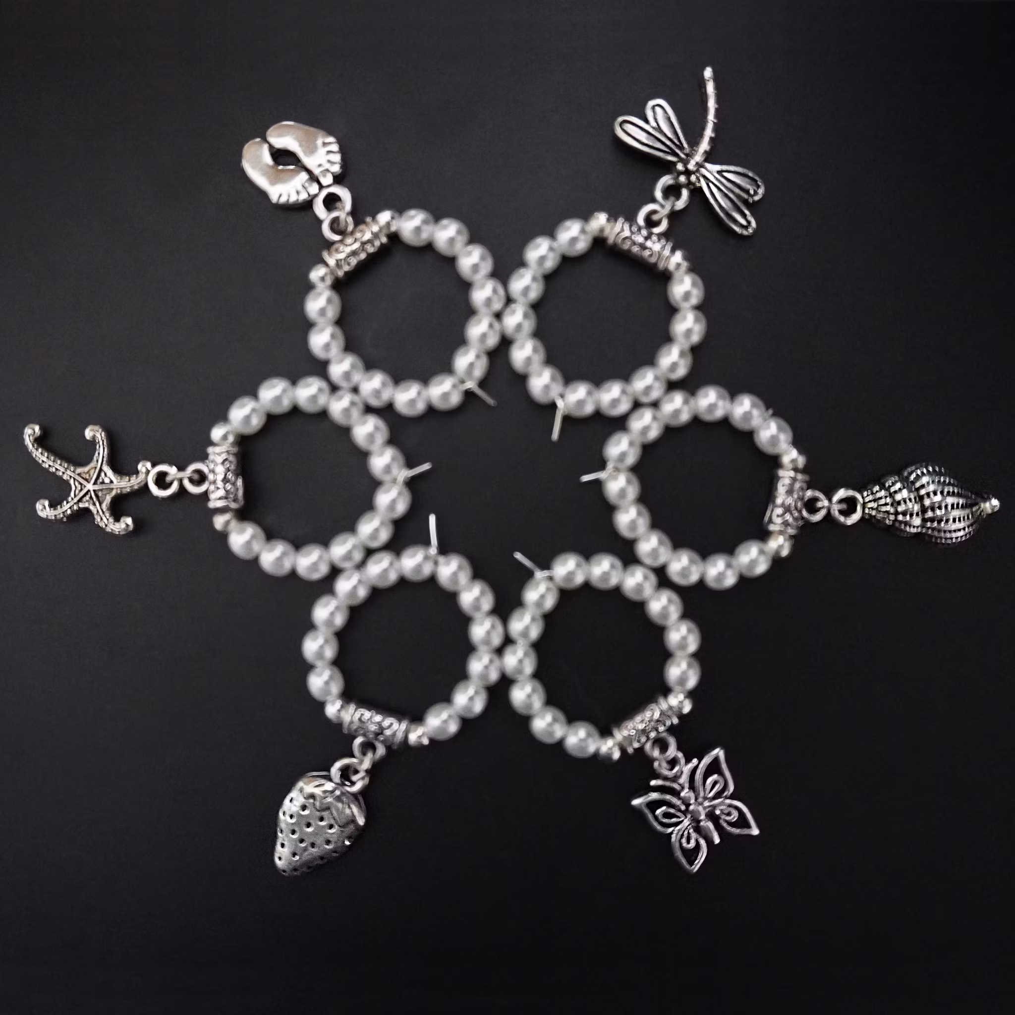Glasmarkörer med örhängesknäppning, i set om 6 st. Silverpläterad stomme och vita pärlor från Preciosa. Berlocker med sommartema.